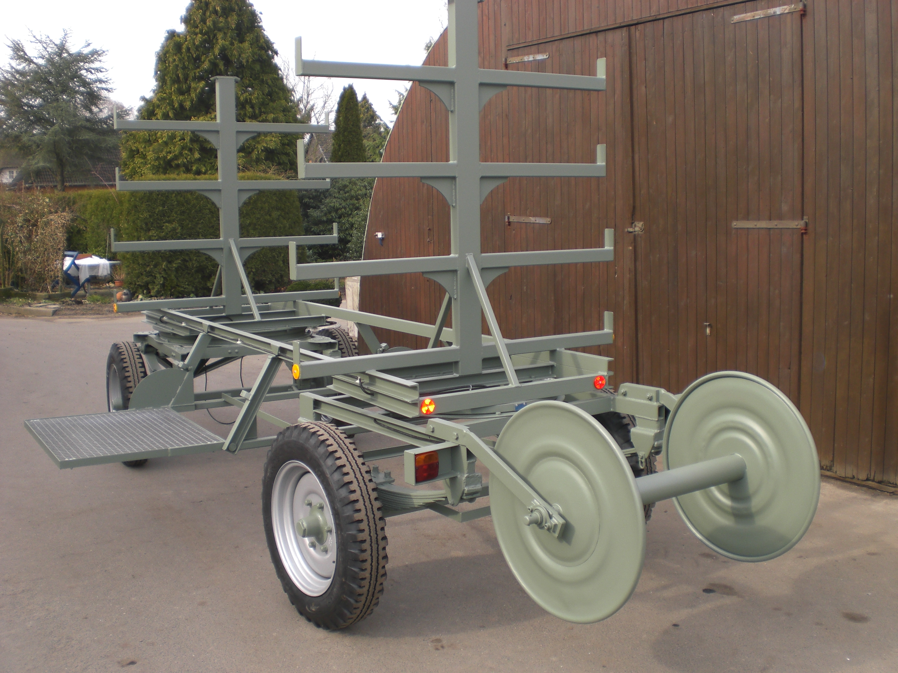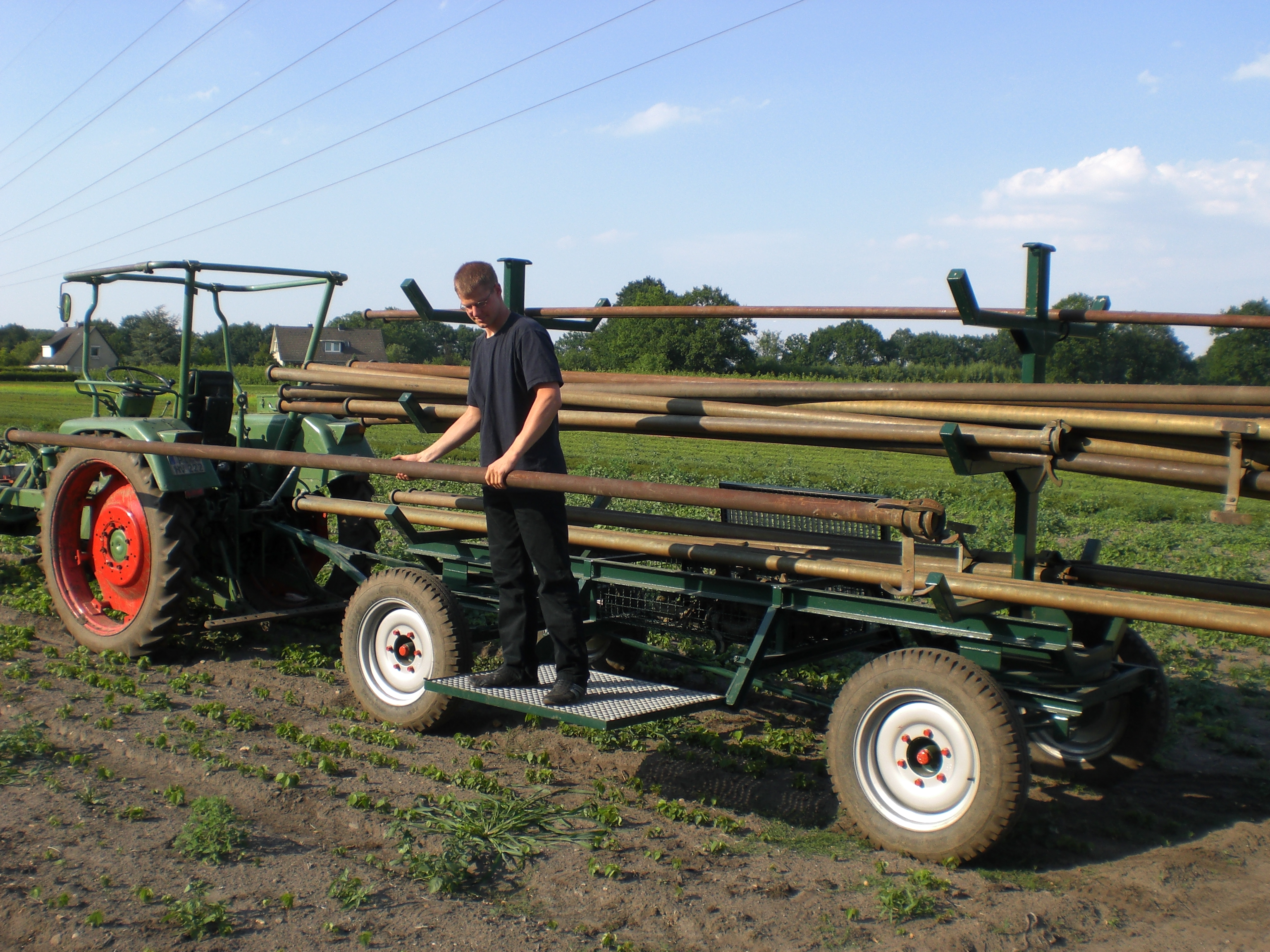 Zum Transportieren von Beregnungsrohren und Zubehör ist der Bewässerungsanhänger gedacht. Es können ca. 150 Rohre geladen werden und es ist noch Stauraum für Formstücke und Regner. Außerdem kann optional eine Schlauchhaspel montiert werden. Der Anhänger hat eine Spurweite von 1.50 m damit man über die Beete fahren kann. Beidseitig ist eine Arbeitsplattform angebaut, von der man die Rohre in den nächsten Steig legen kann. Einachsig oder zweiachsig mit Doppellenkkranz.