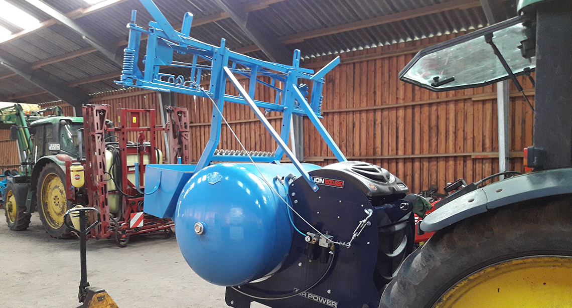 KOMPRESSOR Kompressor mit Gelenkwelle angetrieben um z.B. 12 Druckluftscheren zu betreiben. Mit Gestänge für Schlauchführung.